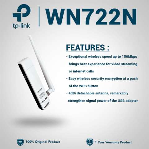 Wireless N USB Adapter TL-WN722N memungkinkan Anda untuk menghubungkan komputer desktop atau notebook ke jaringan nirkabel dan akses koneksi internet berkecepatan tinggi. Sesuai standar IEEE 802.11n, mereka memberikan kecepatan nirkabel hingga 150Mbps, yang bermanfaat untuk game online atau bahkan video streaming. Juga enkripsi keamanan nirkabel dapat dibentuk hanya dengan menekan tombol QSS (Keamanan Quick Setup), mencegah jaringan dari ancaman luar.